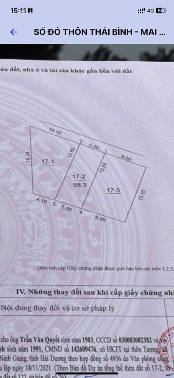 Cần bán 68m2(5×13,6) đất thổ cư Thái Bình Mai Lâm